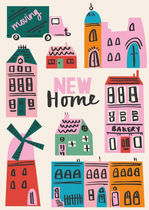 This greeting card design features an illustrated townhouse with detailed windows, floral decorations, and a red front door, conveying a warm and cheerful atmosphere. The text on the card reads, “Lovely New Home.”