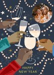 A stylish, celebratory New Year card featuring an illustration of four arms coming in from the edges, all holding glasses of bubbly, clinking them together. There is one photo upload area inside of a circle in the top right corner. There are also stars, snowflakes and hanging beads in the background.