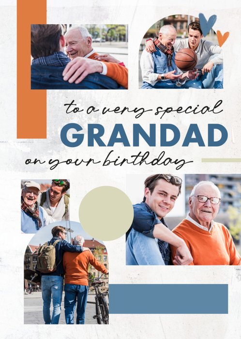 A minimalistic, touching and heartfelt photo upload birthday card featuring photo frames decorated with blue and orange rectangular shapes and hand-drawn hearts, on top of a grunge textured background. There are 5 photo upload areas.