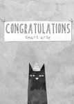 Featuring an illustration of a black cat wearing a party hat with a banner above containing black outlined typography, all on a grey paper effect background.
