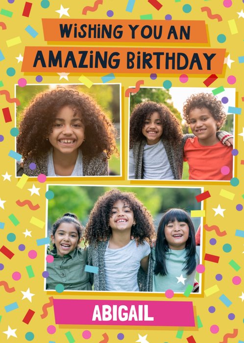 Featuring vibrant typography with three photo frames.