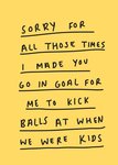 "Sorry for all those times I made you go in goal for me to kick balls at when we were kids."