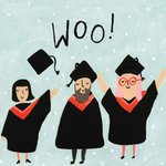 Featuring an illustration of three graduates dressed in black gowns with red collars, throwing their caps in the air and celebrating, with black handwritten typography above, all on a light green patterned confetti background.