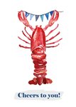 Featuring a red lobster holding a string of blue pennant flags on a white coloured background.