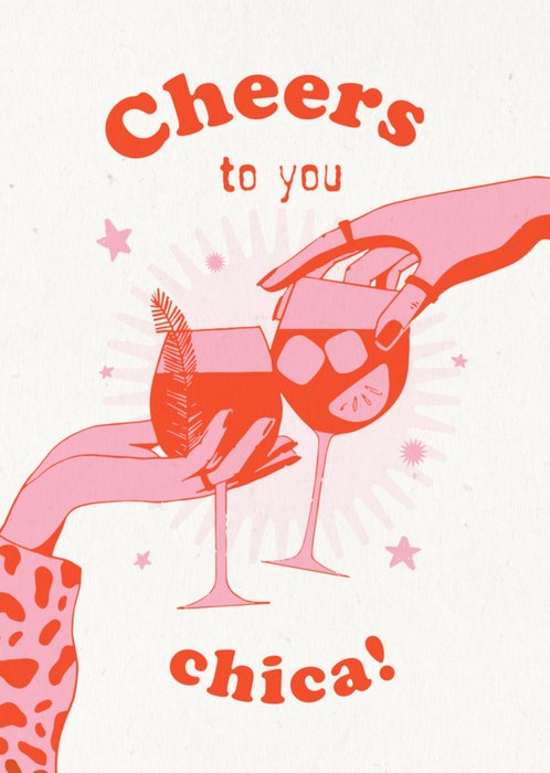 Featuring two illustrated hands clinking cocktail glasses with starbursts and small stars in coral and pink tones on a light cream background.