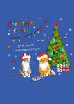 Front of card: Featuring an illustration of two cats in Santa hats among a Christmas scene with presents under the Christmas tree and a wrapped-up fish sitting in front of them on a blue background with colourful playful typography.
