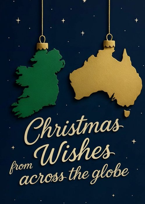 Featuring hanging baubles shaped like Ireland and Australia with small stars, on a dark blue background.