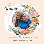 Front of card: Grandma's Photo Upload Mother's Day Card Circular frame surrounded by a watercolour illustration of flowers. Text reads: "To a lovely granny if you were a flower I'd pick you. Happy Mother's Day".