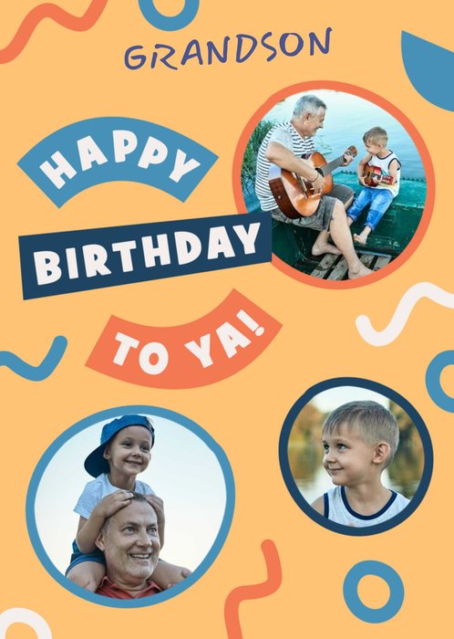Front of card: Grandson's Photo Upload Birthday Card Circular photo frames and funky shapes on an orange background. Text reads: "Grandson happy birthday to ya!". 'Grandson' can be personalised!