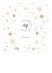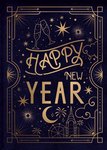 A striking Art Deco style New Year card featuring illustrated icons depicting New Years Eve celebrations iconography, including champagne flutes clinking, fireworks exploding, stars, a crescent moon, clouds, London landmarks, all in a gold foil effect on top of a paper texture. The whole thing is encased in an elegant Art Deco frame made up of lines, curves, arrows and dots.