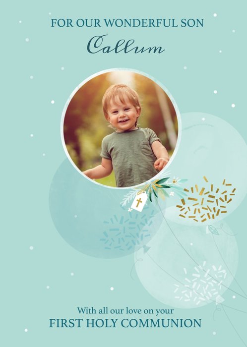"For our wonderful son Callum, with all our love on your first holy communion" with Callum being editable