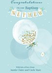 Front of card: Card features a cute illustration of a balloons filled with confetti with a banner above which reads Nephew The text reads: "Congratulations on your baptism with lost of love from auntie Claire and Uncle Marc" With editable text options
