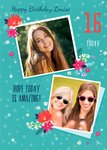 Front of card: Illustrated flowers on polka dot, blue background with two square photo frames Text reads: "Happy Birthday Louise. 16 today. Hope today is amazing!" With editable recipient and age.