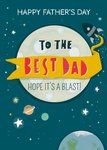Front of card: Illustrated space scene with rocket and planets. Text reads: "Happy Father's Day To the best Dad, hope it's a blast!" With editable text. Back of card: Colette Barker logo. Moonpig logo.
