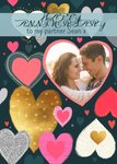 Front of card: Features cute illustrations of hearts that cover the card with a heart shaped photo upload The text reads: "Happy Anniversary To my Partner Sean x" With editable text options