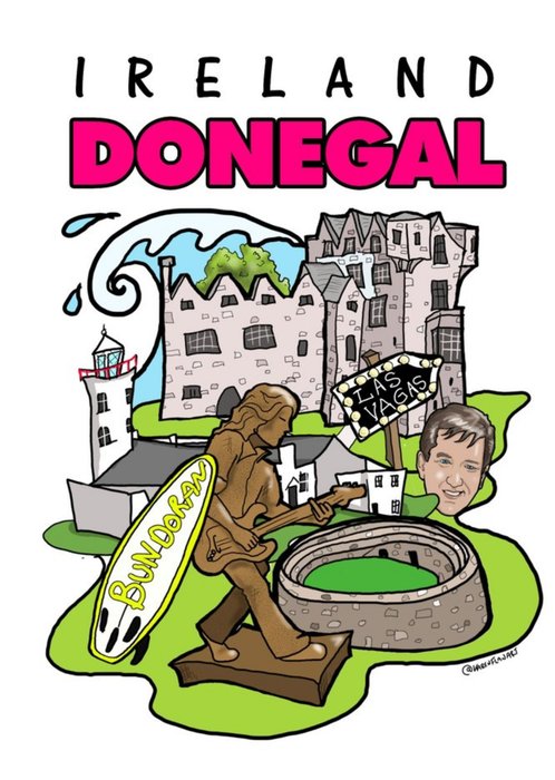 Collage Illustrations including Donegal Castle, Grianán of Aileach fort, Las Vagas sign, light house, surf board, statue of Rory Gallagher, and a portrait of Daniel O'Donnell.