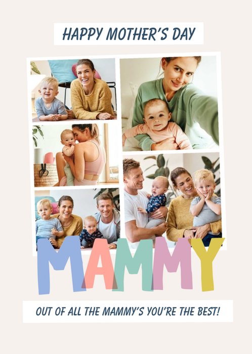 Front of card: Mother's Day Photo Upload Card Collage of five photo frames with colourful typography. Text reads: "Happy Mother's Day Mammy out of all the mammy's you're the best!".