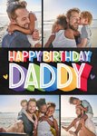 Front of card: Daddy's Photo Upload Birthday Card Colourful 3D text with 4 photo frames on a black textured background. Text reads: "Happy birthday Daddy".