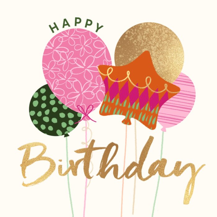 A modern design featuring a green and gold birthday message framing a bunch of colourful balloons with bows and patterns on a cream background.