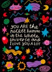 Features a jam-packed design of big, bold, colourful outer space themed illustrations like moons, planets and shooting stars on a black background. In the centre of the card amongst the illustrations is what, handwritten text.