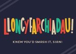 Pretty Funny Words Welsh typographic congratulations card. The bright non editable caption reads LLongyfarchiadau, followed by the editable I Knew You'd Smash It recipient's name. The card background colour is navy blue.