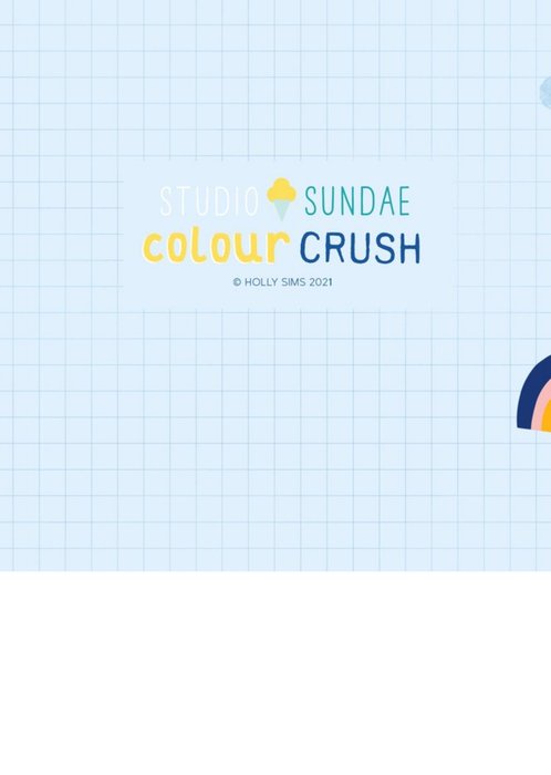 Front of card: Back to School Photo Upload Card Colourful typography surrounded by rainbows and clouds on a graph paper background. Text reads: "Back to School! Good luck in your new class Imran". 'Back to' and 'good luck in your new class Imran' can be personalised!