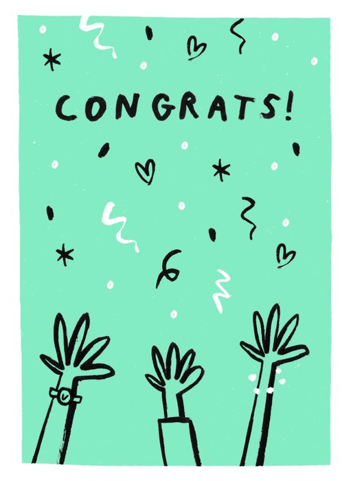 Featuring a fun illustration of raised hands along the bottom with scattered confetti, hearts and hand-drawn text on a mint green background with a white edge.