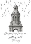 Featuring a hand-sketched illustration of Trinity College Dublin’s Campanile, surrounded by grey confetti streamers & elegant script text below, all on a white background.