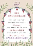 Front of card: Coronation Celebration Card Featuring a sentimental message to King Charles with the crown and United Kingdom flags. Text reads: "HRH King Charles III you are our much admired and noble King our memories of your Coronation will last a lifetime 6th may 2023 love the miller family". 'Love the miller family' can be personalised!