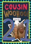 Featuring colourful, hand-painted effect typography with one photo upload frame that has a white starburst-shaped border. The card is adorned with decorative painted stripes in various colours against a dark blue background embellished by diagonal teal stripes. It’s a personalised card celebrating a cousin's 21st Birthday with enthusiasm and admiration.