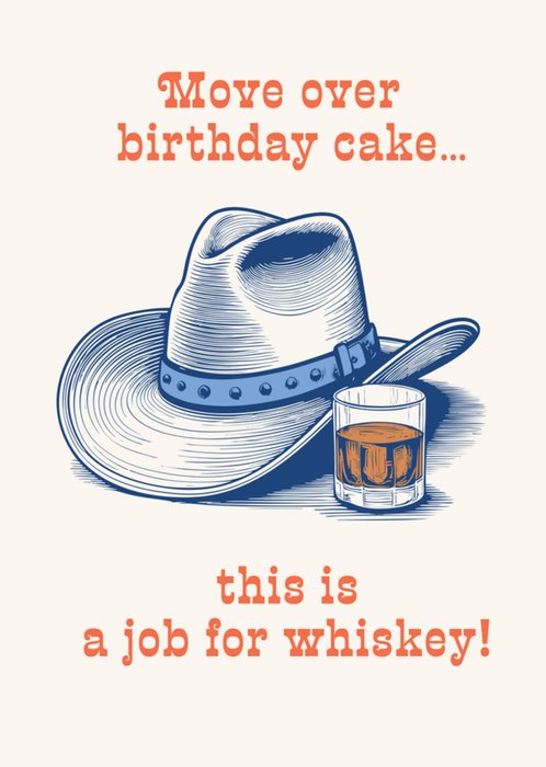 Featuring a detailed illustration of a cowboy hat and a glass of whiskey with bold orange typography delivering a cheeky message, perfect for someone who’d rather sip whiskey than eat cake, all on a white background.