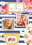 Cup Of Tea And Teapot Stripes Personalised Photo Upload Happy Birthday Card