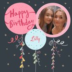 Cute illustration of pink and blue birthday balloons with personalised photo upload option on dark background.