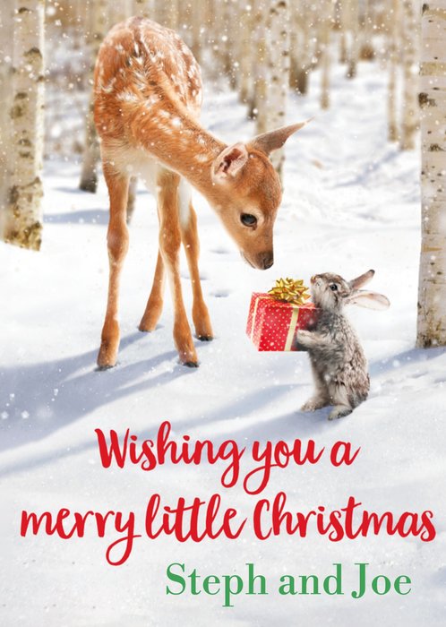 Front of card: Featuring a snowy woodland scene with a bunny rabbit giving a present to a baby reindeer. Text reads: "Wishing you a merry little Christmas Steph and Joe".