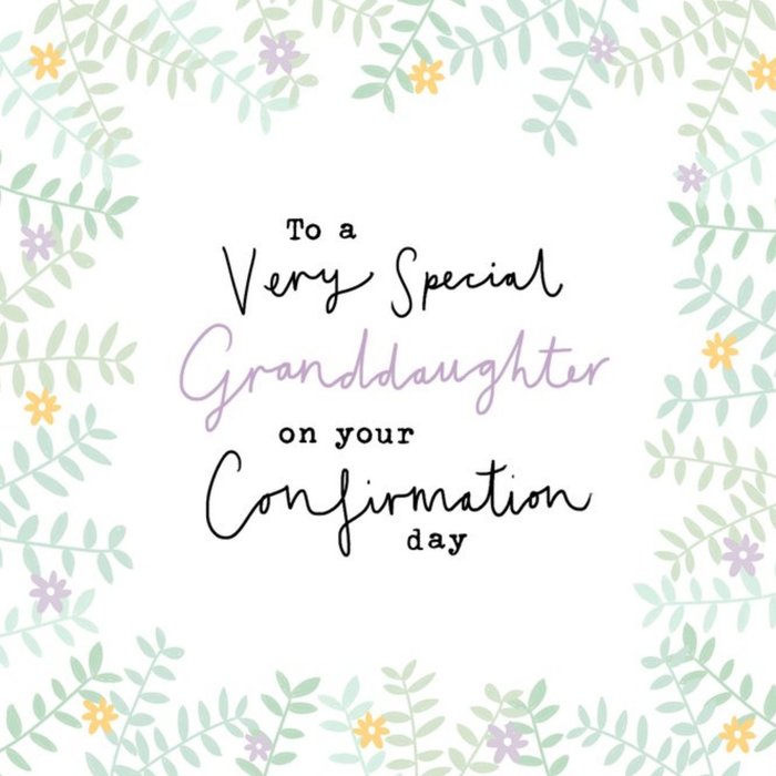 Front of card: Card features illustrated flowers around the card with typographic text in the middle The text reads: "To a very special granddaughter on your confirmation day"