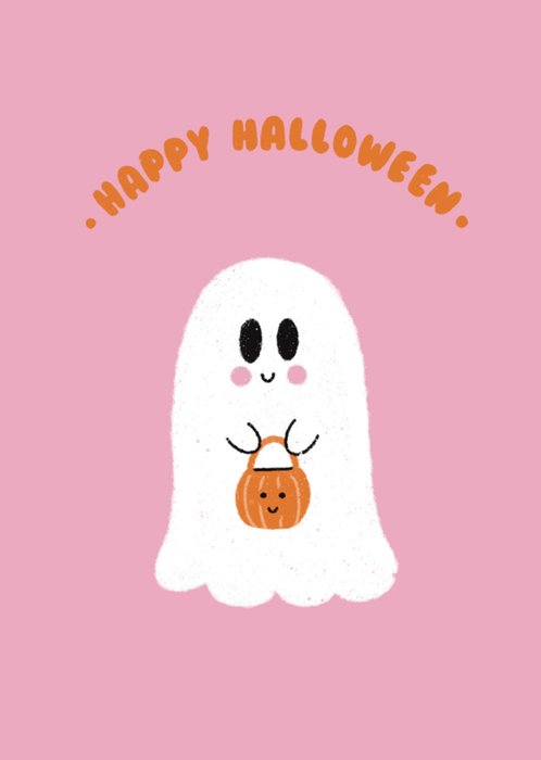 Featuring a cute cartoon ghost holding a pumpkin bucket on a pink coloured background. With orange text above.