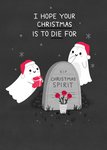 Front of card: Featuring a cute illustration of two ghosts in Christmas hats, they are bringing presents to a tombstone that reads "RIP Christmas Spirit." Text reads: "I hope your Christmas is to die for."