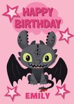 Front of card: Cute How To Train Your Dragon Toothless Birthday Card Features cute illustration of Toothless on a pink background with pink stars. Text reads: "Happy Birthday Emily" Emily is customisable.