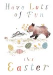 Front of card: Featuring a cute illustration of a bear a hare and a mouse running through grass, surrounded by small baby chicks and Easter eggs. The bear has a bunch of yellow flows in it's mouth. There is multicoloured text in pastel tones at the top and bottom of the card.