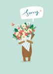 Featuring a cute, neat illustration of a brown bear holding a big bunch of flowers in front of their face. There is a speech bubble above their head that reads 'sorry'.