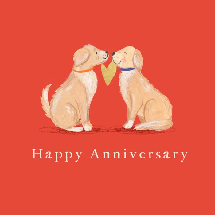 Featuring an illustration of two golden retriever dogs facing each other with a gold heart between them on a red background.