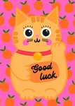 Front of card: Featuring a cute and colourful design of a ginger waving lucky cat holding a 'Good Luck' sign. The background comprises of oranges in a repeat pattern against a pink background.