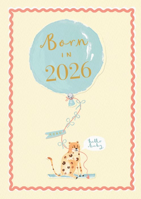 Featuring a cute illustration of a leopard holding the string of a large blue balloon in it's mouth, on a pastel yellow background, with a wavy border.