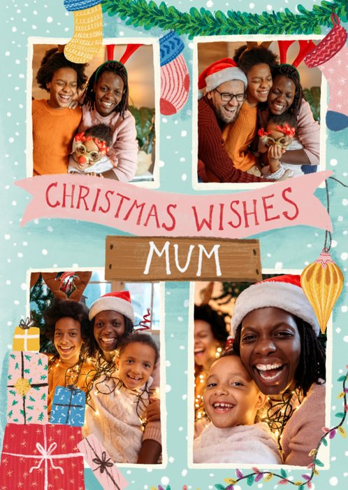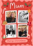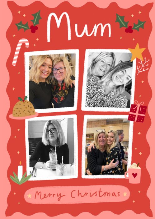 Featuring 4 photo frames surrounded by cute illustrations of a candy cane, a Christmas pudding, a candle, a present, a mug of hot chocolate, some holly & stars, with hand-drawn chalk & script effect text on a red & pink background.