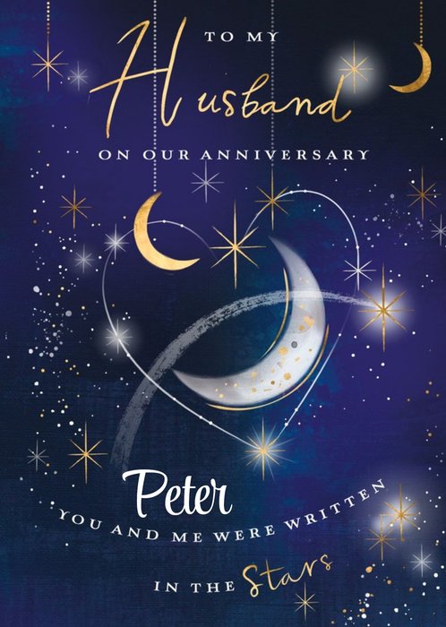 Front of card: Illustration of two rabbits looking up at night sky together sat on woodland hillside filled with leaves. The text reads: "Happy anniversary Husband. 40 years. I love you so much and always will." With editable recipient.