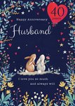 Front of card: Illustration of two rabbits looking up at night sky together sat on woodland hillside filled with leaves. The text reads: "Happy anniversary Husband. 40 years. I love you so much and always will." With editable recipient.