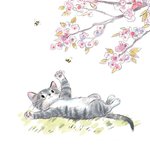Features a watercolour style illustration of a tabby kitten laying on it's back on the grass next to a pink blossom tree.