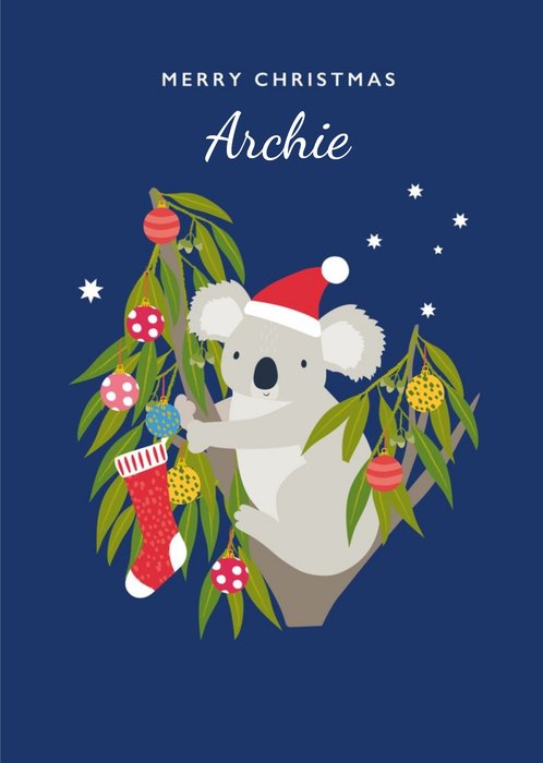 Front of card: Merry Christmas Card Cute illustration of a koala perched in a tree with decorations. Text reads: "Merry christmas Archie". 'Archie' can be personalised!