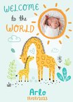 Front of card: Welcome To The World Photo Upload New Baby Card Cute illustration of a mother and baby giraffe. Text reads: "Welcome to the world Arlo 17/07/2023". 'Arlo 17/07/2023' can be personalised!
