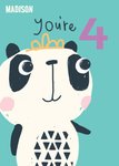 Front of card: Illustrative design of a cute Panda wearing a tiara with editable typographic text on a turquoise background Text reads: "Madison You're 4" With customisable name and age.